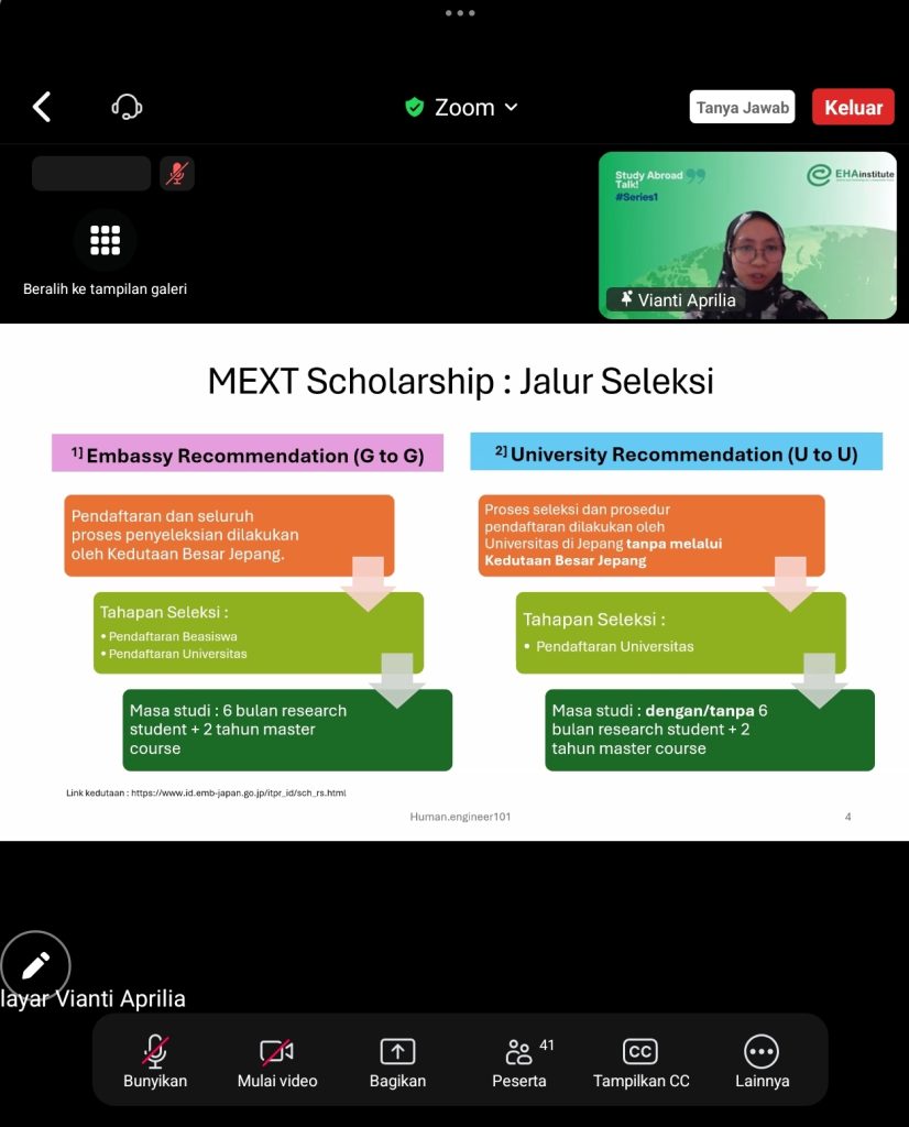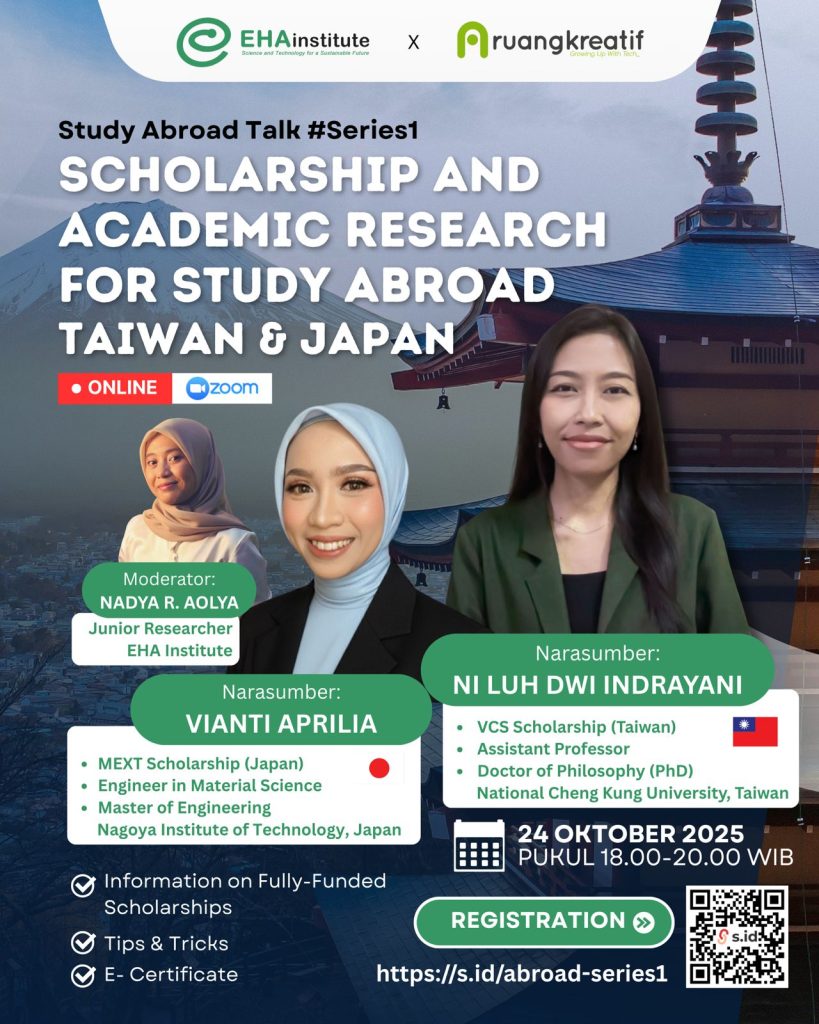 EHA Institute bersama Ruangkreatif sukses menyelenggarakan kegiatan Study Abroad Talk #Series1 pada Jumat, 24 Oktober 2025, secara daring melalui Zoom Meeting. Sesi perdana ini mengangkat tema “Scholarship and Academic Research for Study Abroad in Taiwan & Japan”, yang berfokus pada peluang beasiswa dan pengalaman riset akademik di dua negara tujuan studi populer di Asia, yaitu Jepang dan Taiwan.
